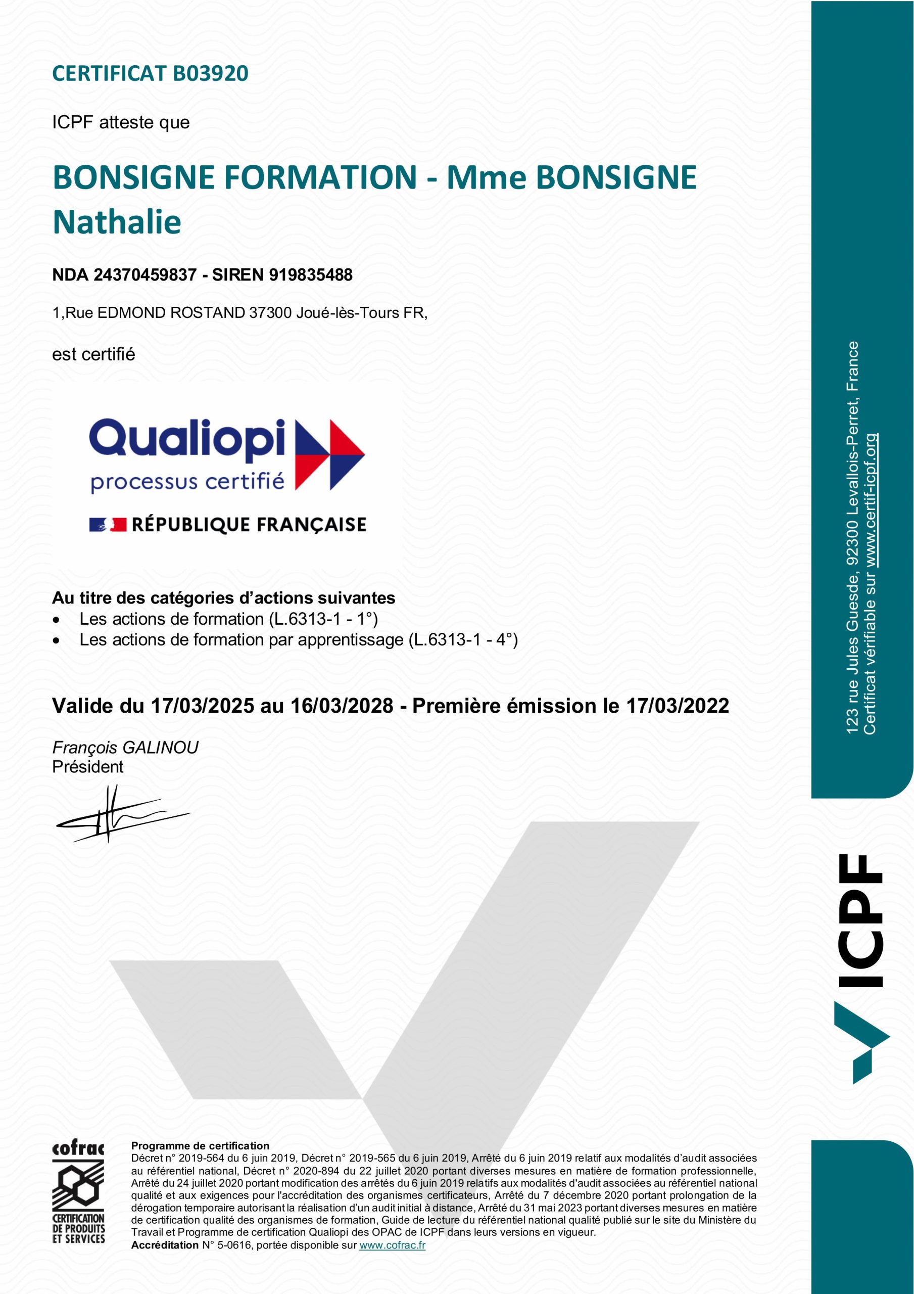 Dirigeante et Formatrice de BONSIGNE FORMATION, je suis heureuse de vous accueillir au sein de notre centre de formation dédié aux métiers du secteur sanitaire et social.